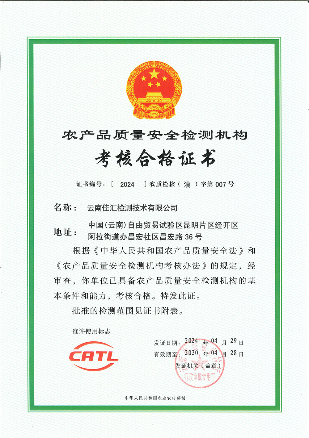 農(nóng)產(chǎn)品質(zhì)量安全檢測機構(gòu)考核合格證書